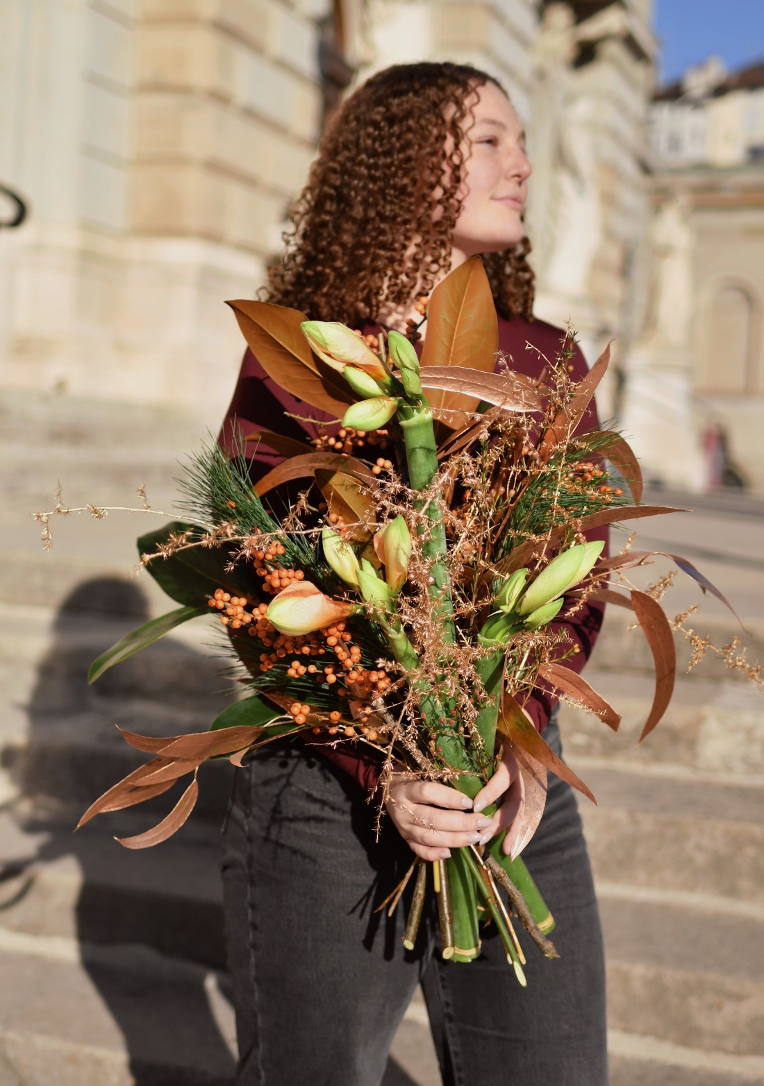 Ce bouquet, composé de magnifiques amaryllis saumonées et de branchages festifs, est le cadeau parfait pour émerveiller vos proches. Sa longévité remarquable en fait un choix idéal : les amaryllis, connues pour leur floraison exceptionnelle, offrent des fleurs qui durent et battent chaque année des records de tenue.